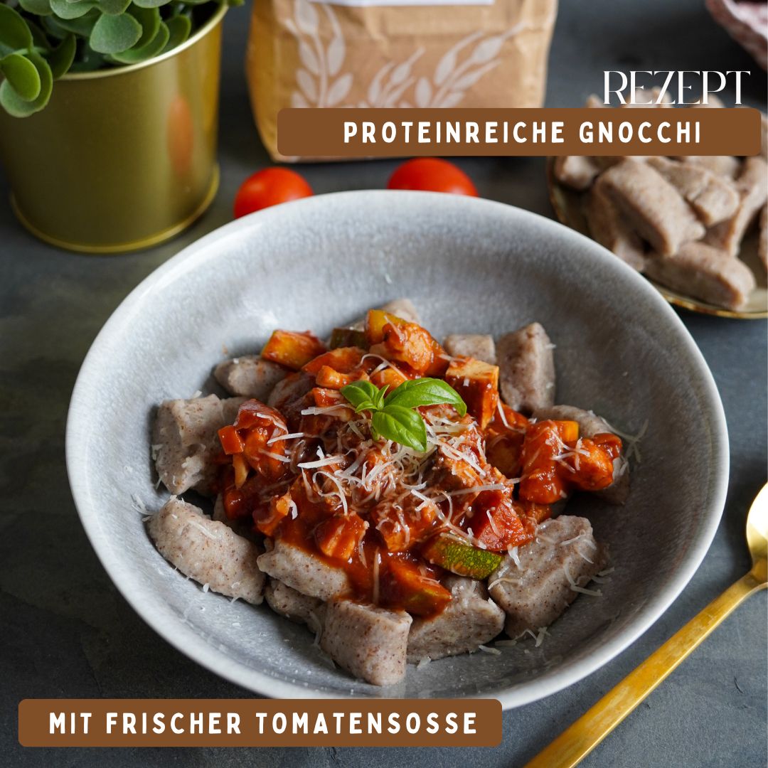 Unsere Gnocchi werden aus unserer hochwertigen Bio-Proteinmehlmischung hergestellt – sie sind wunderbar fluffig und liefern dabei wertvolles Eiweiß für bewussten Genuss.. In Kombination mit einer fruchtig-würzigen Tomatensoße und frischem Gemüse entsteht ein ausgewogenes Gericht, das satt macht und einfach guttut – perfekt für alle, die bewusst genießen wollen!