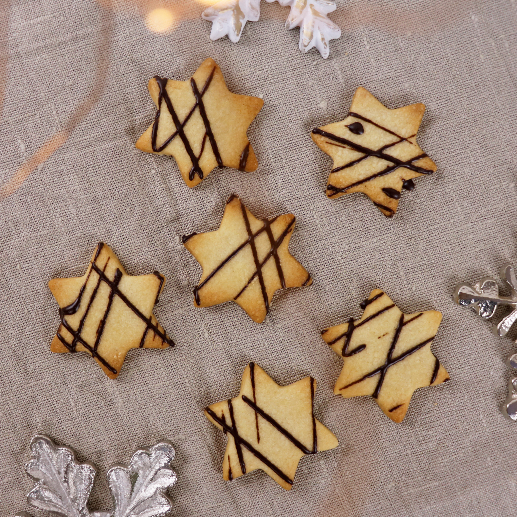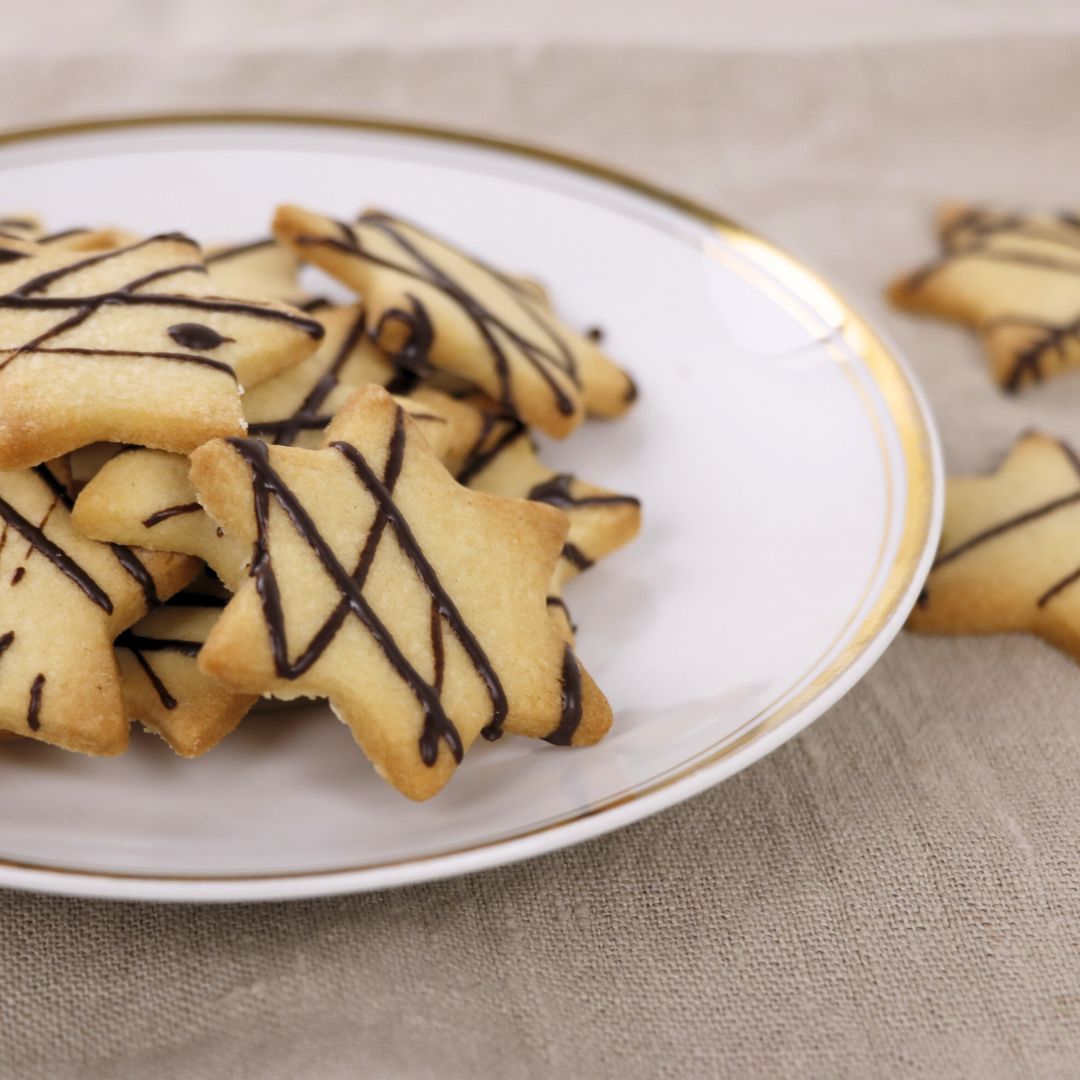 6. Die ausgekühlten Kekse mit Schokolade verzieren.