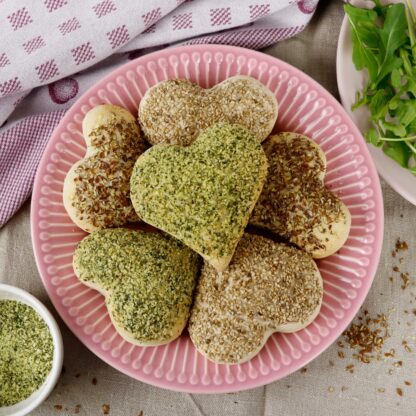 Den Teig bei Raumtemperatur 1/2 Stunde zugedeckt ruhen lassen. Den Teig nochmal kurz durchkneten und ausrollen. Herzen mit einem passenden Keksausstecher ausstechen und auf ein Backblech legen. Mit Wasser bestreichen und mit verschiedenen Sämereien bestreuen. Nochmals 1/2 Stunde gehen lassen.