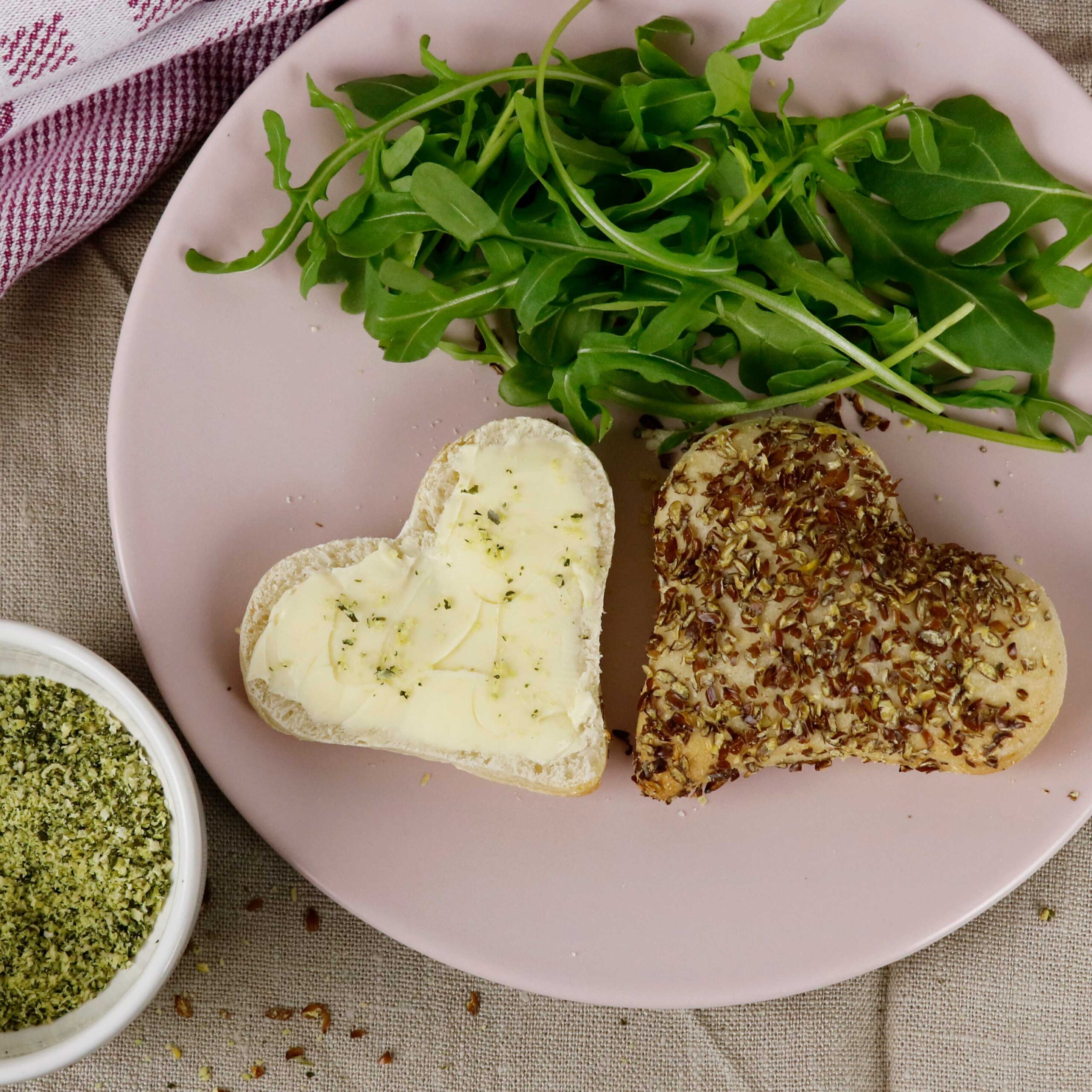 Den Teig bei Raumtemperatur 1/2 Stunde zugedeckt ruhen lassen. Den Teig nochmal kurz durchkneten und ausrollen.  Herzen mit einem passenden Keksausstecher ausstechen und auf ein Backblech legen. Mit Wasser bestreichen und mit verschiedenen Sämereien bestreuen. Nochmals 1/2 Stunde gehen lassen.