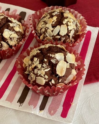 Als Topping Mandelblättchen auf den Teig streuen. Die Muffins backen.